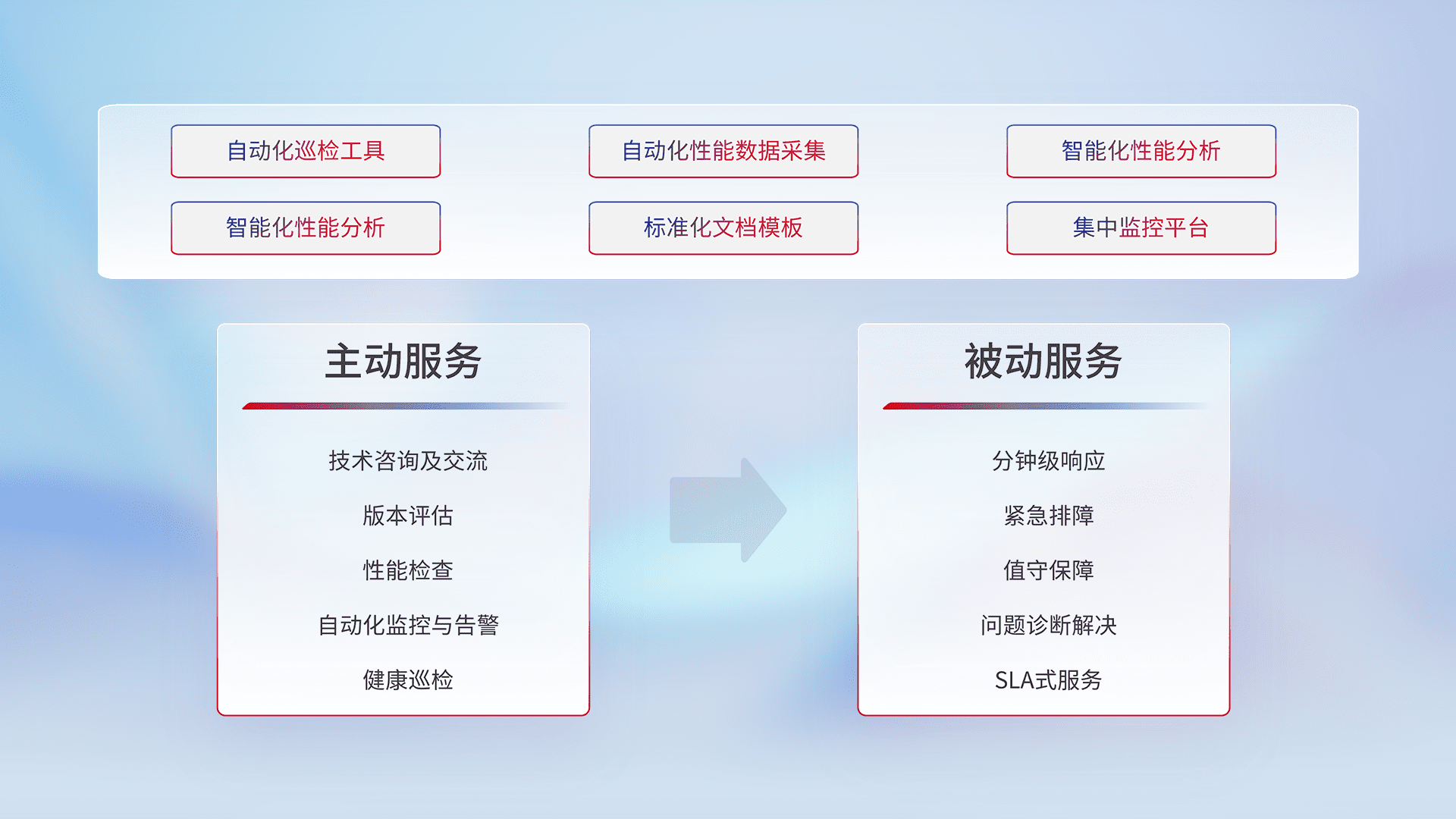 智能化工具和标准化文档,,,,保障服务质量,,,提供主动服务(包含技术咨询、、、、版本评估、、、、性能检查、、自动化监控与告警、、健康巡检)和被动服务包含(分钟级响应、、、、紧急排障、、、值守保障、、、、问题诊断解决、、、、SLA服务)。。。