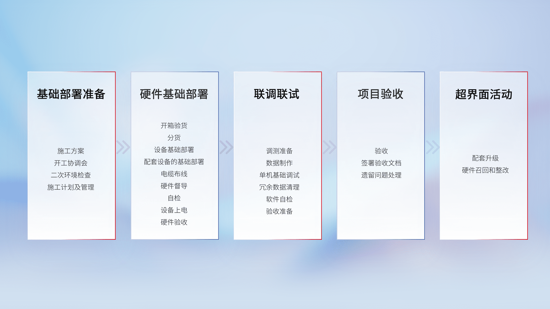 从基础部署准备、、硬件基础部署、、、联调联试、、、项目验收、、、越界面活动的全过程可追溯,,,保证施工质量和进度。。